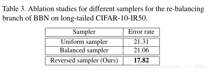 Conventional Learning Branch在一个训练epoch中,训练数据集中的每个样本以相同的概率采样一次。均匀采样器保留了原始分布的特征,有利于表征学习。然而,Re-balancing Branch的目的在于缓解极端的不平衡,特别是提高尾类(tail类)的分类精度,尾类的输入数据来自于反向采样器。对于反向取样器,每个类的采样可能性与其样本大小的倒数成正比,即类中的样本越多,类具有的采样可能性越小。