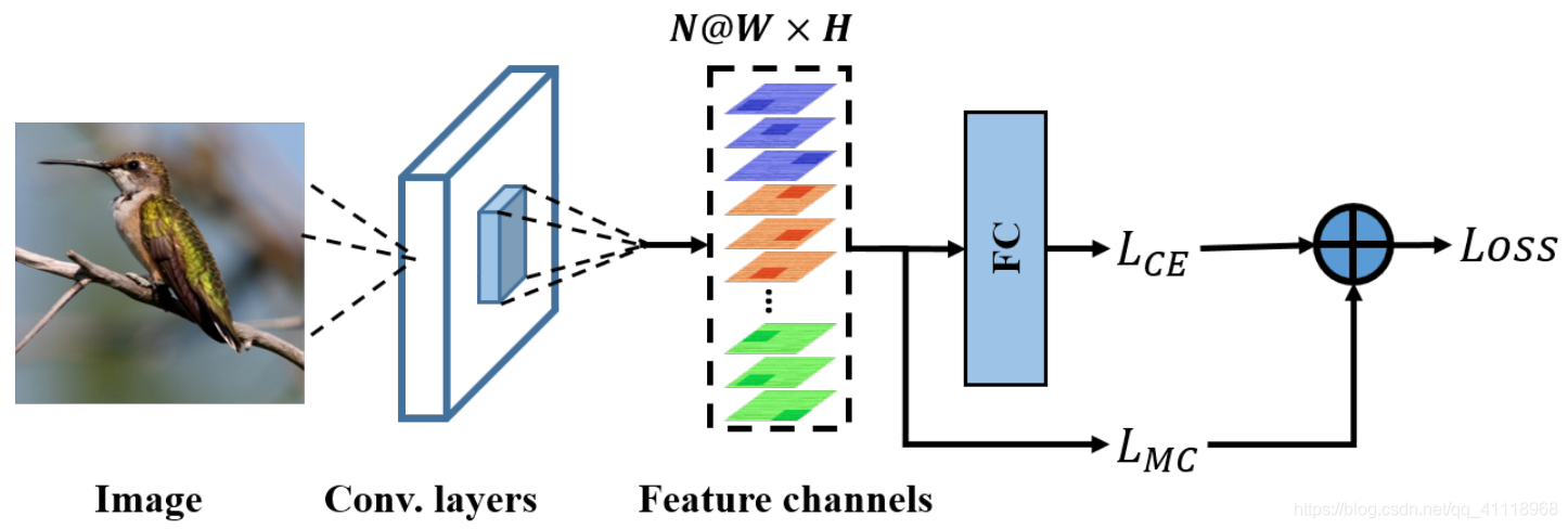 随后,$F$进入网络的两个流,其中两个不同的损失针对两个不同的目标定制。在上图中,$L_{C E}$流将$F$视为输入到全连接层中,作交叉熵损失,在这里,交叉熵损失鼓励网络提取主要集中在全局判别区域的信息特征。$L_{M C}$流监督网络聚焦不同的局部区分性区域,对$L_{M C}$做一个加权得到总的损失: